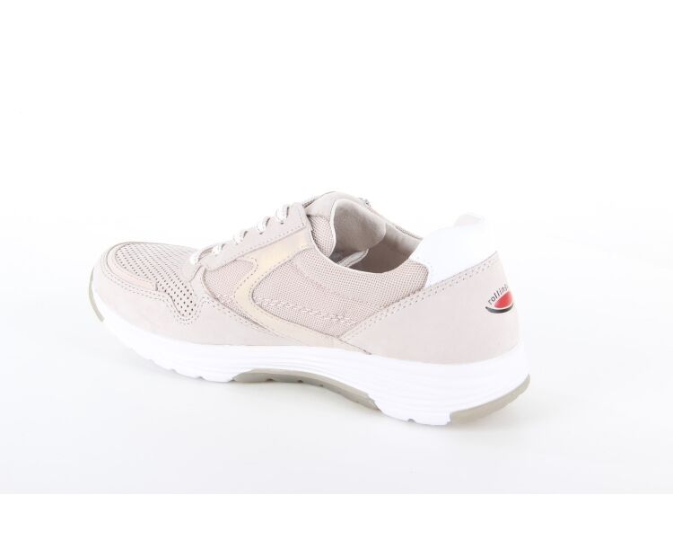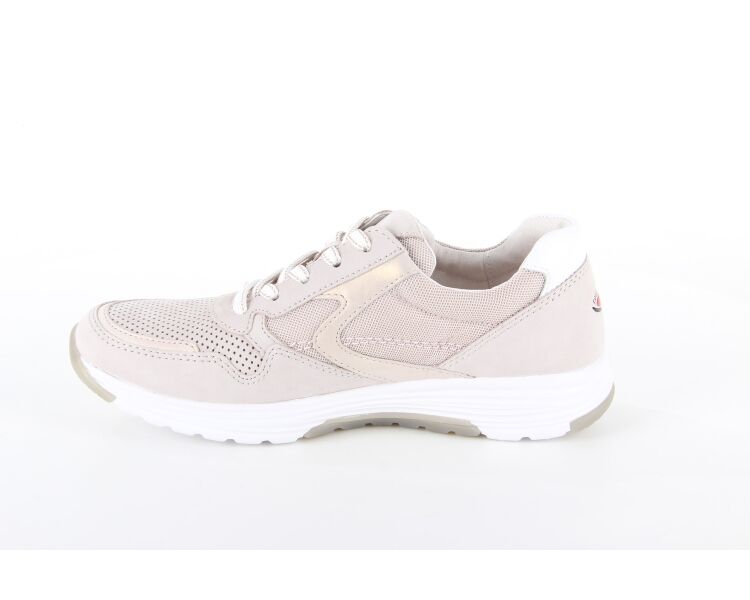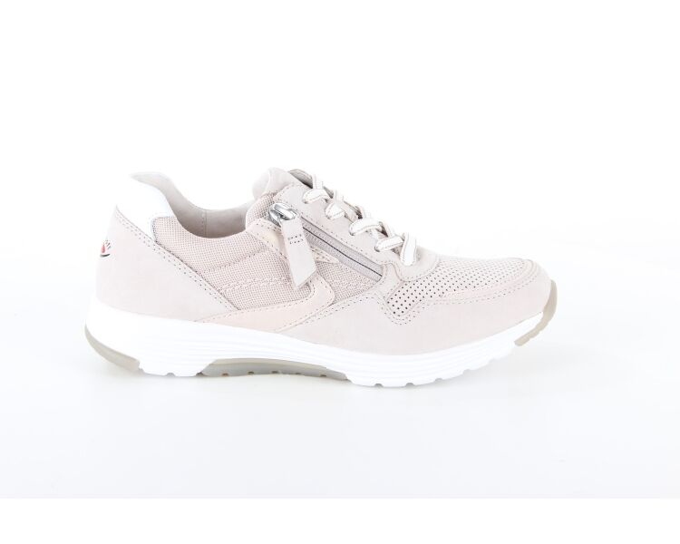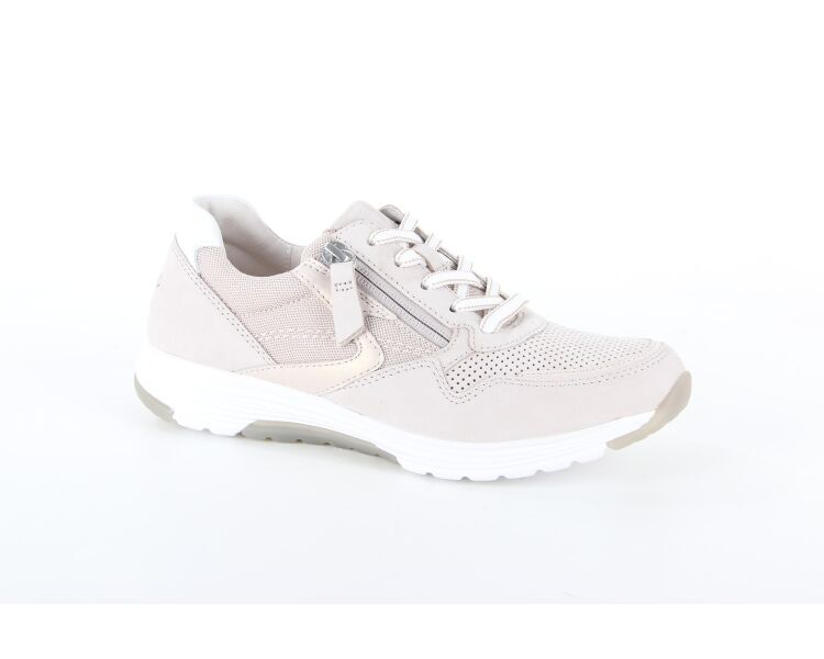 Mooie veterschoen van het merk Gabor. Deze beige schoen is gemaakt van nubuck en heeft aan de bovenkant van de schoen perforaties gaatjes. De sneaker is voorzien van een vetersluiting en een ritssluiting, dit vergemakkelijkt het aan- en uittrekken. Het voetbed is uitneembaar.