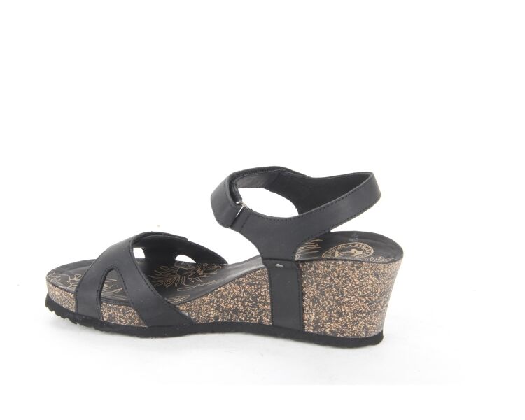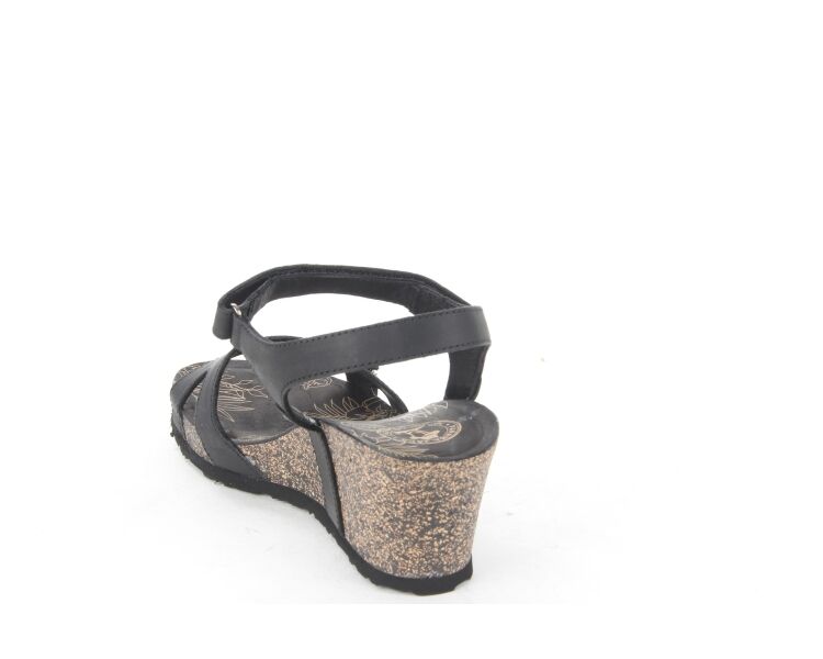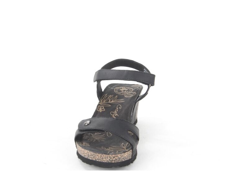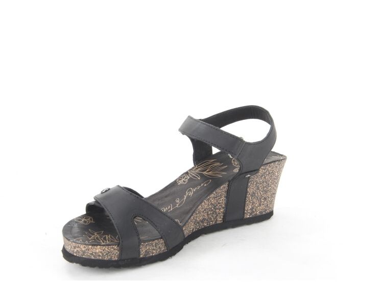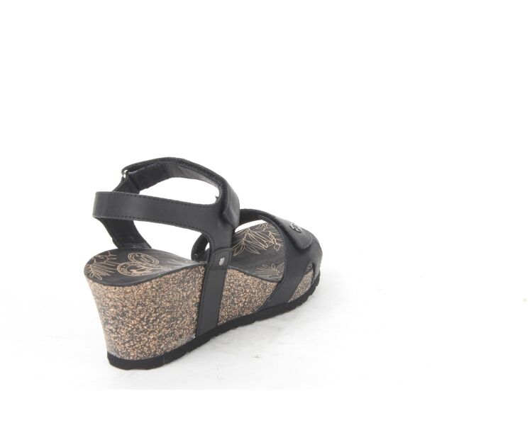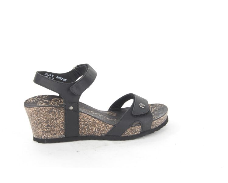 Comfortabele damessandaal van Panama Jack. De Julia Basics B1 sandaal is gemaakt van zwart nubuckleer en voorzien van met klittenband verstelbare bandjes. De sleehak is gemaakt van kurk en afgewerkt met een rubberen zool die zorgt voor grip.